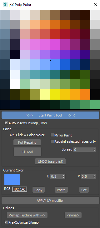Installation/Testing: Run the macro script PolyPaint.ms, and find it under 'pX Tools' category as 'Poly UV Painter' when customizing your menus. (Or comment/disable first line on the code starting with macroScript before running it if you only want to try it without installing) Requisites: The object to paint has to be an Editable Poly with applied material with a diffused bitmap. - With the object selected click 'Start Paint Tool'. It will display the texture on the window and prepare the model for the painting.