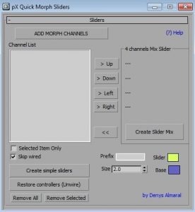 - Install pxQMorphSliders.ms on your 3Ds Max. - Customize your menus: Category: 'pX Tools', item: 'MorphSliders'. - Open Quick Morph Sliders floater. - Select an object with the Morpher modifier applied. - Click: ADD MORPH CHANNELS to feed the list. - Click: Create simple sliders. - Done! :D All of your morpher channels now have simple shape controls wired to them.